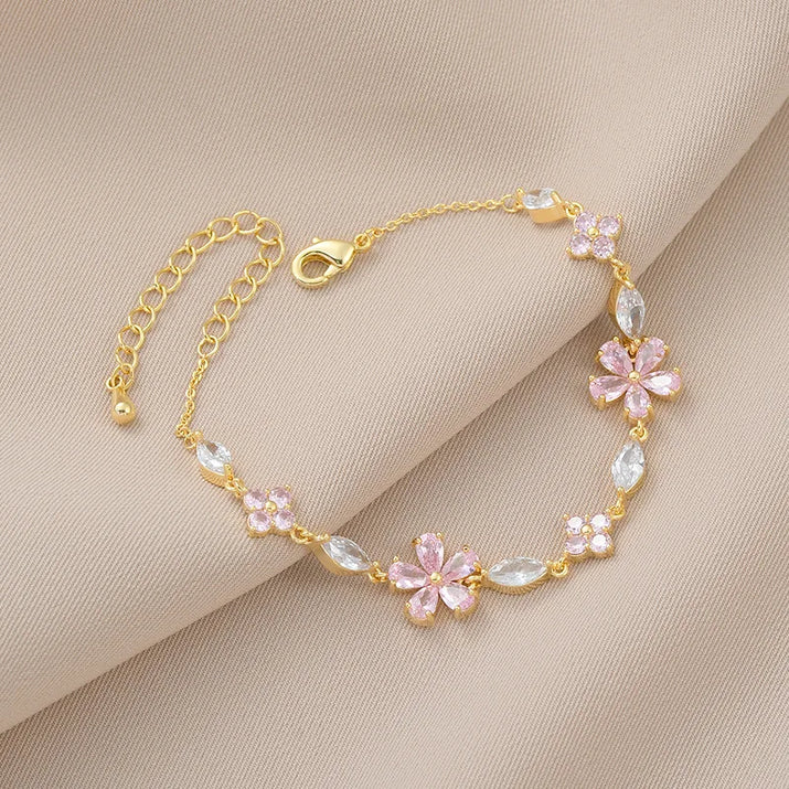 Enhance your style with a radiant floral bracelet, beautifully crafted to embody the elegance of nature. Featuring sparkling zircon crystals, it adds a touch of glamour to any outfit.